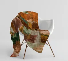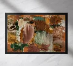 Una composizione astratta con macchie di terracotta, arancione, marrone e verde tenue, che suggerisce una veduta aerea di campi coltivati o un paesaggio terroso fortemente strutturato. Stile Bob Nugent.