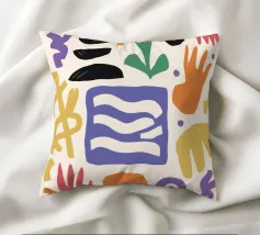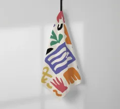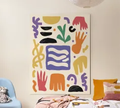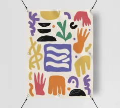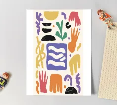Una composizione astratta e minimalista di varie forme organiche e geometriche in una disposizione equilibrata, utilizzando una tavolozza tenue e terrosa di terracotta, nero e beige.