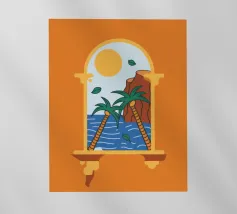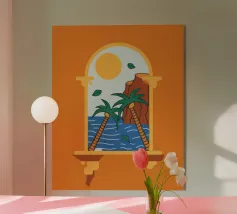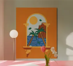Una vista attraverso una finestra ad arco color terracotta rivela una serena scena di spiaggia con una palma e il mare. Quest'opera d'arte evoca un senso di pacifica evasione e di destinazioni calde e soleggiate.