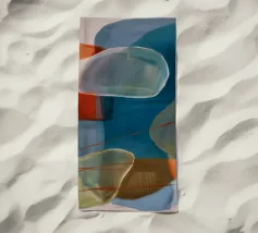 Una serena composizione astratta con forme sovrapposte e arrotondate simili a ciottoli in un'armoniosa tavolozza di blu, terracotta, verde e beige, con texture sottili.