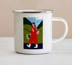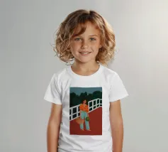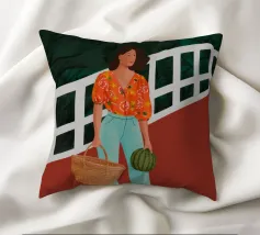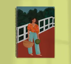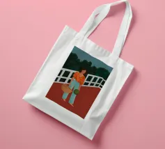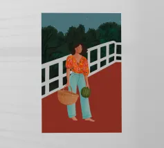 Un uomo in piedi su una terrazza illuminata dal sole, con in mano un cesto di prodotti, osserva un paesaggio tranquillo, catturando un momento di pace e di benessere mattutino.