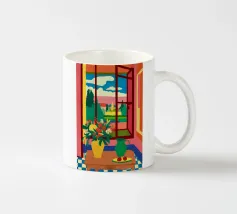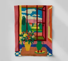 Natura morta di un bouquet di fiori e di una ciotola di limoni su un tavolo, su una terrazza che si affaccia su uno splendido paesaggio costiero. La scena cattura l'essenza calda, vibrante e deliziosa di una vacanza mediterranea.