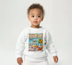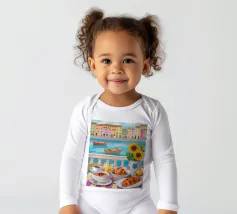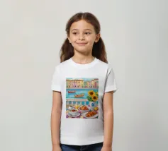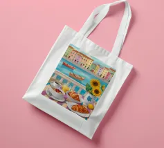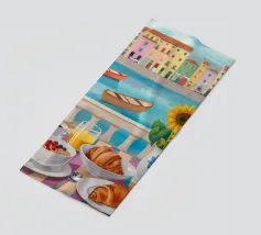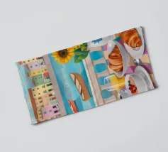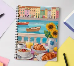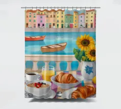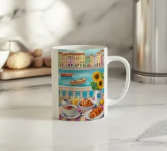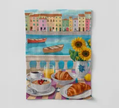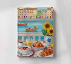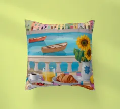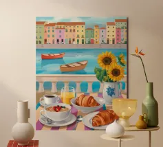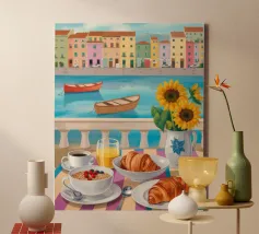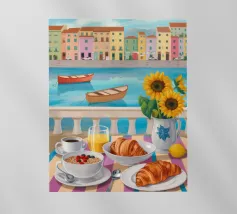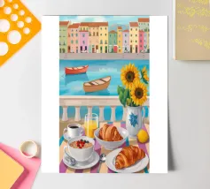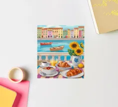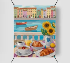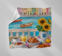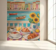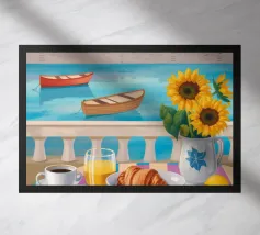 Una colazione serena su una terrazza affacciata sul mare scintillante, con croissant, caffè e girasoli, che evoca una perfetta mattina di vacanza.