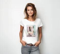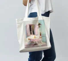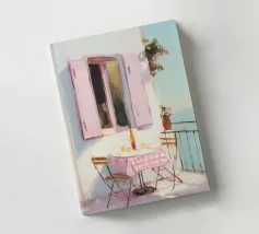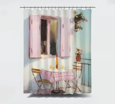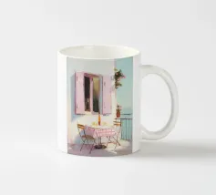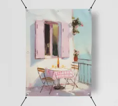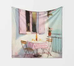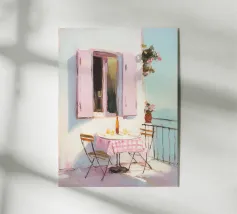 Il motivo raffigura un'affascinante scena di balcone mediterraneo in tenui colori pastello. Un tavolino con una tovaglia rosa, due sedie e una bottiglia invitano a soffermarsi al sole. Le pennellate morbide e la luce calda trasmettono una sensazione di estate, leggerezza e vacanze al mare.