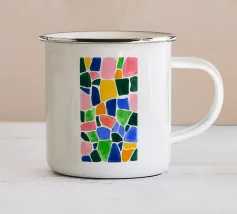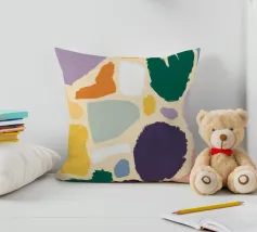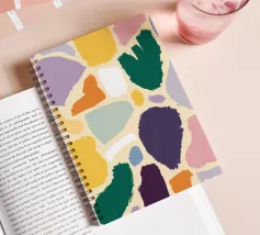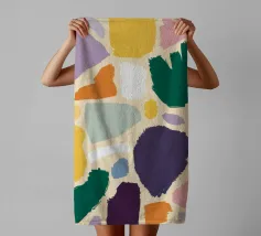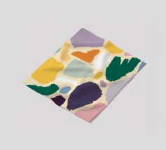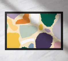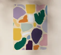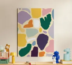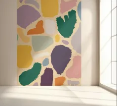 Un collage astratto di varie forme che ricordano i motivi del terrazzo. La sofisticata palette di colori viola, verdi e beige crea un'opera d'arte chic, moderna e materica.