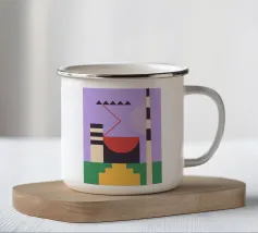 Forme geometriche audaci in colori contrastanti creano una composizione minimalista. Le tonalità dominanti sono arancione, blu e marrone, con elementi verticali neri e un ovale centrale giallo.