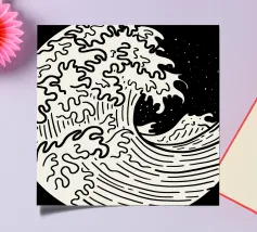 La Grande Onda al largo di Kanagawa raffigura la potenza sublime della natura. È un'illustrazione in bianco e nero con un cielo notturno stellato, che riflette l'ethos culturale e spirituale giapponese.