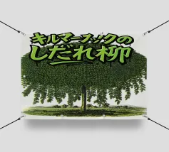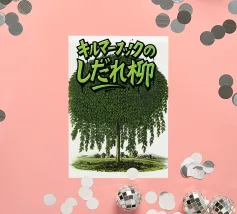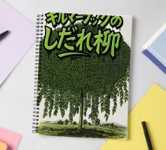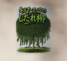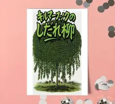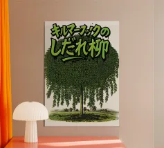 Questa vibrante opera d'arte combina magnificamente un'illustrazione lussureggiante e dettagliata di un salice piangente con un testo Kanji giapponese verde e audace sopra di essa. Il testo, che probabilmente si riferisce alla cultivar "Kilmarnock Weeping Willow", aggiunge un livello culturale e artistico unico. Questo pezzo fonde la serenità della natura con una tipografia di grande effetto, che si rivolge a coloro che apprezzano l'arte botanica, l'estetica orientale e il design grafico contemporaneo. È un'interpretazione visivamente ricca della natura e del linguaggio.