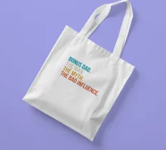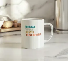Il testo descrive in modo umoristico il patrigno con frasi come "L'uomo", "Il mito" e "La cattiva influenza", in vari colori. Il layout evidenzia ogni sezione con una tonalità diversa, creando un design giocoso e accattivante.