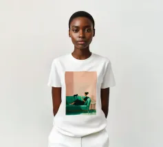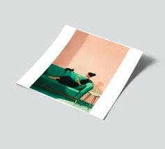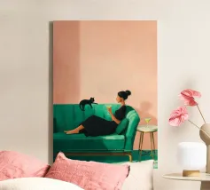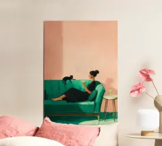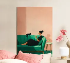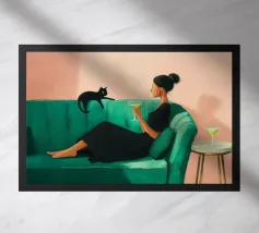 Tra l'ombra e la luce del sole cala un silenzio in cui lei si adagia con tranquilla eleganza, con un martini in mano e un gatto dagli occhi di velluto come compagnia. Il mondo ronza altrove, ma qui - tra i cuscini color menta e le pareti arrossate - la quiete sa di lime e mistero. È un momento distillato in verde e nero: fresco, curioso e completamente suo.