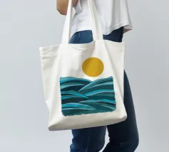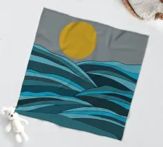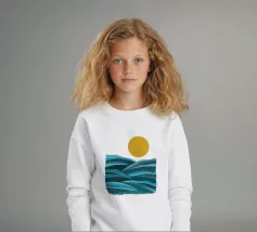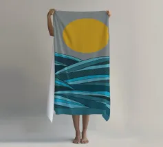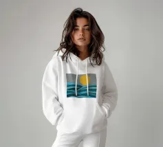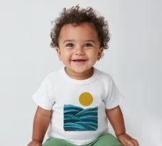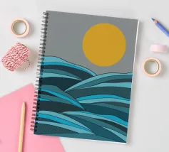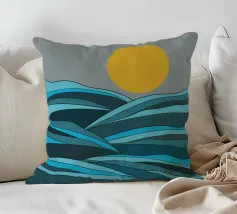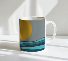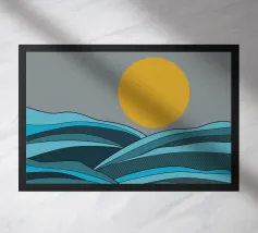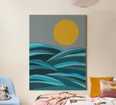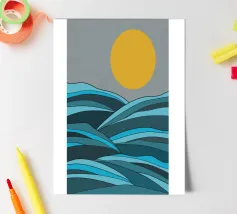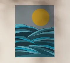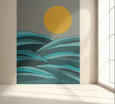 Una line art rilassante con l'oceano, le dolci onde e un sole radioso. Lo stile minimalista e retrò cattura il ritmo pacifico della natura.