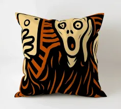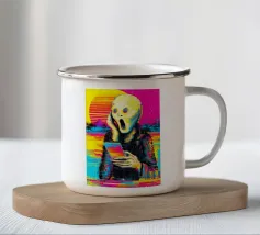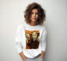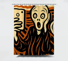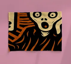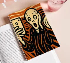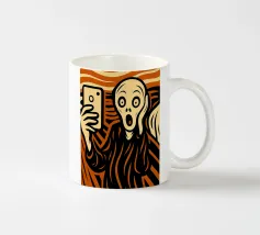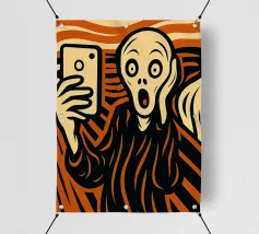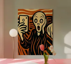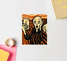 Una figura stilizzata con un'espressione esagerata di shock è raffigurata con in mano uno smartphone, imitando un classico urlo. Linee decise e colori vivaci creano un tocco moderno su un tema famoso.