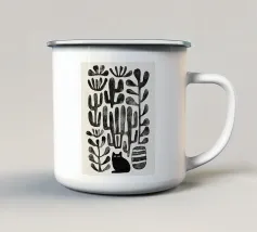Un mistico gatto nero siede sotto una luna crescente, circondato da motivi vorticosi e trame intricate. L'opera d'arte in stile linoleografico evoca un'aria di mistero e magia, fondendo la natura e la notte in una composizione accattivante.