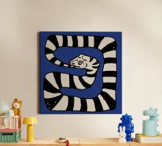 Lo Snake Eating Tail illustra l'intramontabile motivo dell'ouroboros su un audace sfondo blu. Evocando il mistero, la saggezza e l'infinito, quest'opera d'arte unisce l'eredità mitologica al minimalismo moderno, diventando un pezzo unico. Completa la collezione di quattro varianti che possono essere mescolate e abbinate per creare una parete dinamica.
