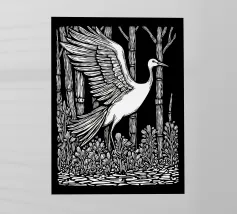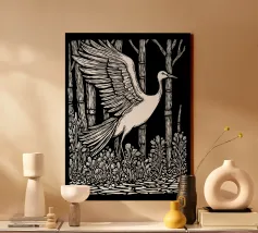 Questa elegante stampa d'arte in bianco e nero mostra una maestosa gru in volo su uno sfondo di bambù e vegetazione lussureggiante della foresta. Creata in un suggestivo stile linoleografico o xilografico, l'opera d'arte combina un intricato lavoro di linee e audaci contrasti, catturando la grazia della natura con un'eleganza senza tempo. Ideale per gli amanti dell'arte della fauna selvatica, dell'estetica giapponese o dell'arredamento ispirato alla natura, questo poster ad alta risoluzione aggiunge un tocco di tranquillità e raffinatezza a qualsiasi spazio. Perfetto da incorniciare in salotto, in ufficio o in un angolo di meditazione.