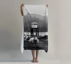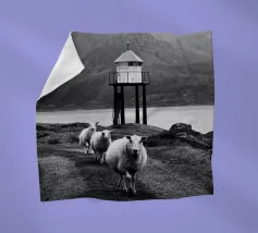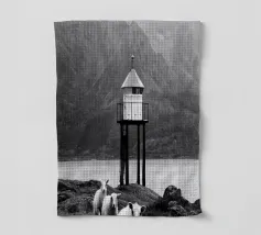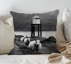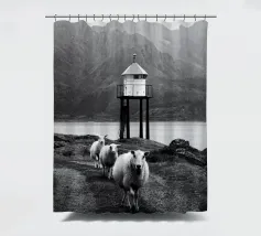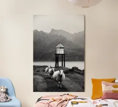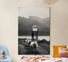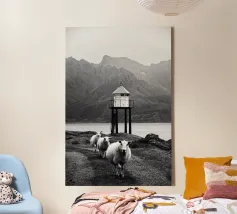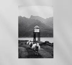 Tre pecore su un sentiero di fronte a Bergen e a un piccolo faro nel nord della Norvegia, sulle isole Lofoten. Un motivo artistico animale in bianco e nero.
