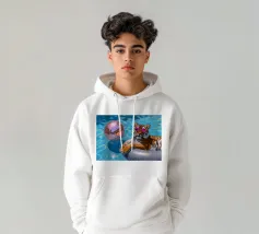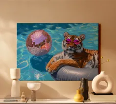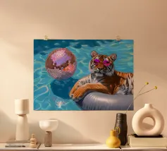 Portate l'ultima festa estiva sulle vostre pareti con il poster "Tiger Disco Pool Party". Questa opera d'arte vibrante e giocosa raffigura una tigre cool che si rilassa in una piscina su un anello gonfiabile, sfoggiando eleganti occhiali da sole rosa, con una grande e scintillante palla da discoteca che galleggia nelle vicinanze. Il blu dinamico dell'acqua, l'arancione deciso della tigre e il rosa riflettente della palla da discoteca creano un'estetica pop art vivace e unica. Perfetto per aggiungere personalità e senso di divertimento a qualsiasi interno moderno o spazio di intrattenimento. La nostra arte digitale è realizzata meticolosamente con una risoluzione di 7000x5000 pixel e una risoluzione di 300