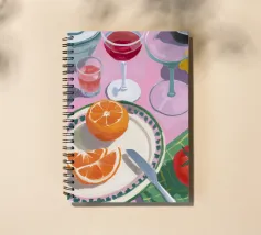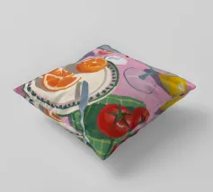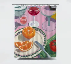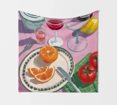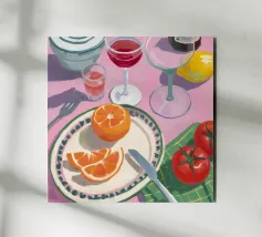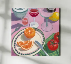 Un primo piano di agrumi e pomodori affettati con bevande frizzanti su utensili rosa suggerisce una freschezza raffinata.