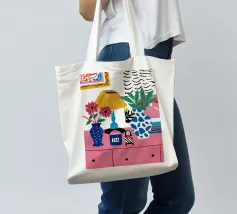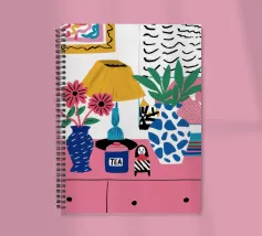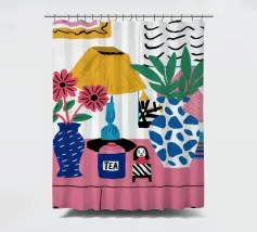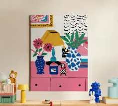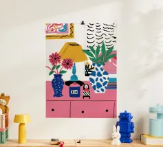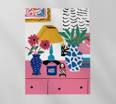 Una natura morta moderna e astratta di un piano del comò con una lampada, un vaso e altre forme colorate e decostruite. L'opera è un'esplorazione giocosa, vibrante e artistica del modello e della forma in un ambiente domestico.
