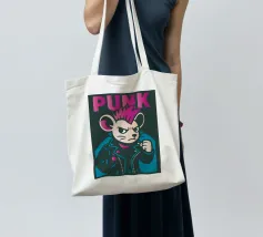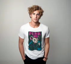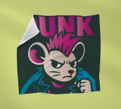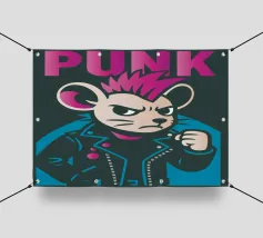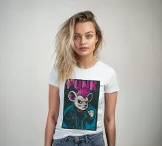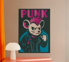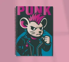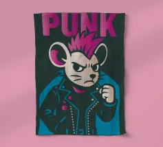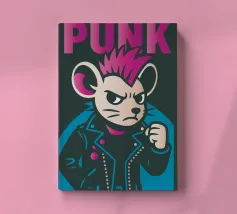Illustrazione di un topo punk ribelle con mohawk rosa e giacca di pelle. Il motivo sfacciato simboleggia il punk, l'individualità e l'anticonformismo, ideale per gli appassionati di musica, lo stile street art e i design alternativi.
