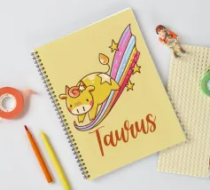 Illustrazione del segno zodiacale del Toro in uno stile simpatico e vivace. Questo gentile toro dorato, che sfreccia lungo una scia di arcobaleno con dettagli di stelle, rappresenta la natura calma ma determinata del Toro. Perfetto per chi ama l'astrologia e cerca un tocco colorato e unico per personalizzare il proprio spazio.