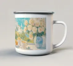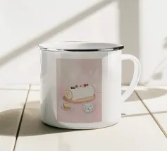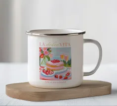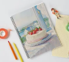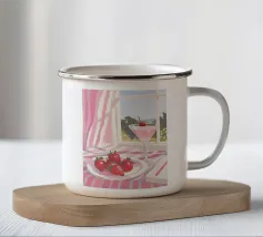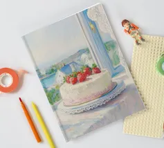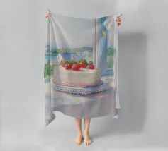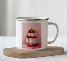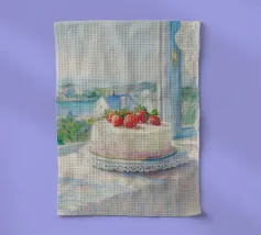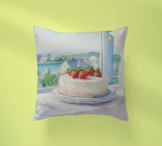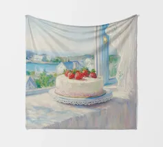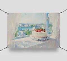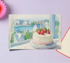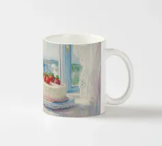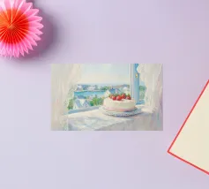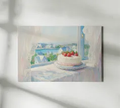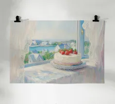 Questo dipinto raffigura una delicata torta di fragole sullo sfondo di un paesaggio pittoresco visibile attraverso una finestra. I toni tenui e pastello e l'attenzione ai dettagli creano una scena serena e invitante che evoca un senso di comfort e di calma.