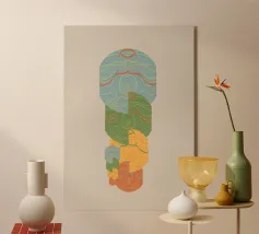Questo poster presenta un sorprendente disegno astratto impilato con forme geometriche piene di linee organiche e vorticose. La miscela unica di toni terrosi blu, verde salvia, senape e ruggine crea un affascinante senso di movimento e consistenza. È un pezzo sofisticato di arte moderna di metà secolo, perfetto per aggiungere interesse visivo a un salotto o a una parete dedicata a una galleria.
