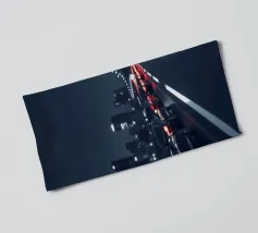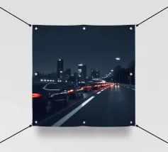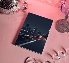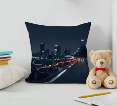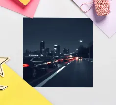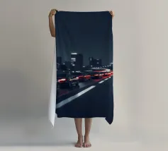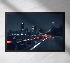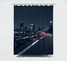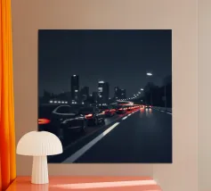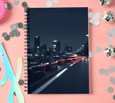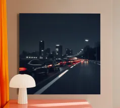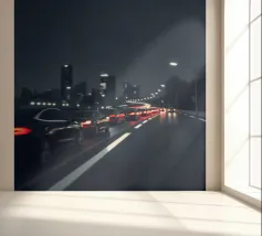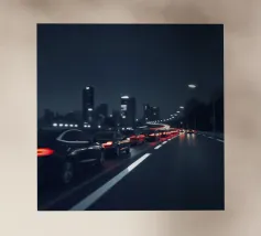Una fila di auto percorre una tortuosa autostrada urbana sotto il cielo notturno, con i grattacieli della città che brillano in lontananza e i lampioni che illuminano la strada davanti a noi.