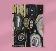 Un complesso intreccio di forme a U, linee variegate ed elementi organici in rosa, giallo, bianco e verde acqua su uno sfondo scuro crea un misterioso arazzo a motivi.