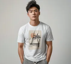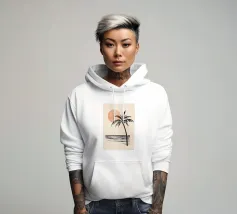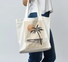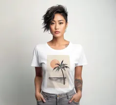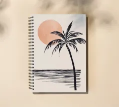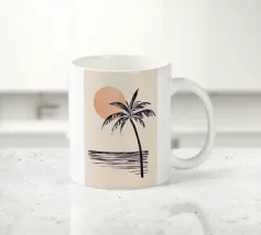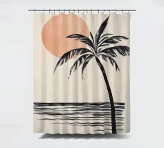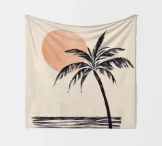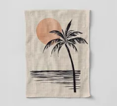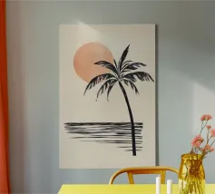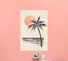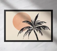 Illustrazione minimalista della silhouette di una palma nera su un tranquillo tramonto, con morbide sfumature di pesca e calme onde oceaniche.