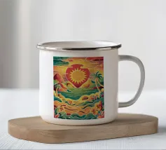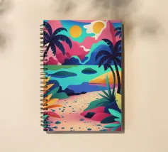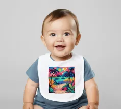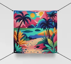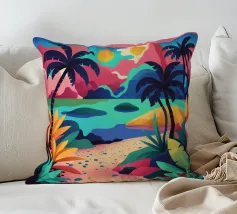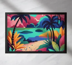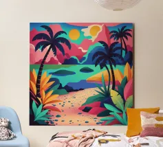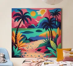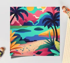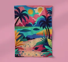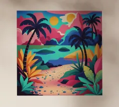 Un'interpretazione vibrante e psichedelica di una scena di spiaggia al tramonto, con palme colorate, un cielo rosa acceso e motivi vorticosi sulla sabbia e sull'acqua, che creano un paradiso tropicale surreale.