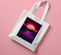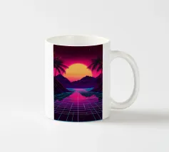 Questo motivo mostra una scena suggestiva in stile retrofuturistico: un enorme sole al tramonto colora il cielo di forti tonalità di giallo e magenta mentre sprofonda dietro una scura catena montuosa. In primo piano corre un pavimento luminoso a griglia che crea una prospettiva in profondità e termina in un corso d'acqua riflettente. Palme tropicali incorniciano l'immagine a sinistra e a destra. Lo stile visivo ricorda l'estetica synthwave e combina elementi naturali con immagini digitali.