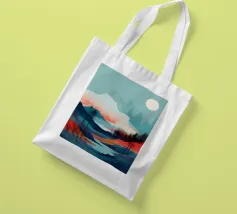 Un tranquillo paesaggio dipinto con un sereno tramonto su un tranquillo lago circondato da dolci colline e da una lontana foresta. I colori vivaci e le pennellate morbide creano un'atmosfera rilassante e onirica.