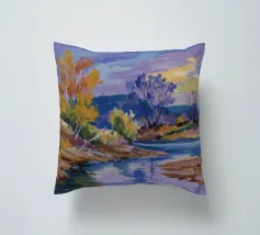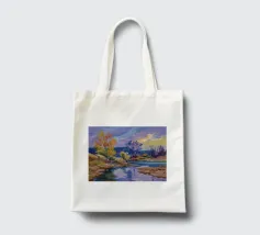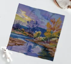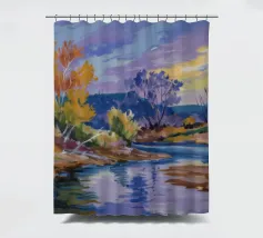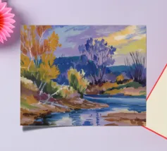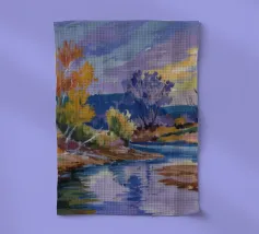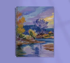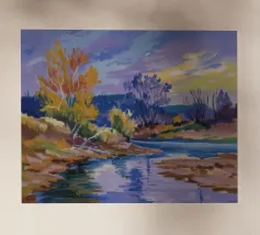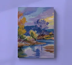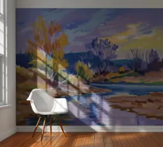 Un sereno paesaggio autunnale che cattura un dolce fiume, le cui sponde sono ornate da esili betulle con foglie giallo-oro, il tutto immerso nella calda luce arancione e gialla di un bel tramonto o di un'alba.