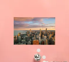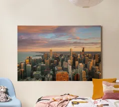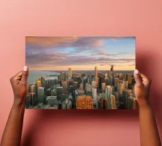 Tramonto sul Loop di Chicago con una calda luce dorata sullo skyline e il lago Michigan visibile sulla sinistra. Nuvole soffici, torri stratificate e una chiara griglia urbana creano una vista della città elegante e sicura per l'arte murale di Chicago.