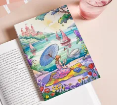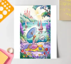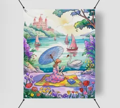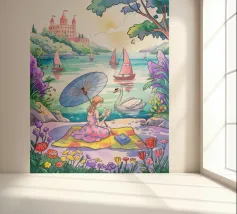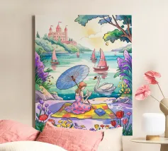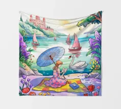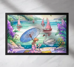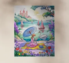 Una donna con un ombrello siede in riva a un lago, con barche a vela e un castello sullo sfondo.
