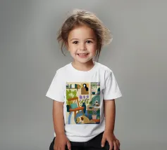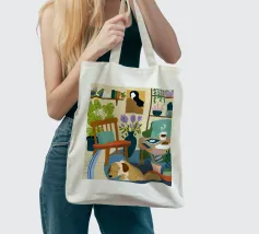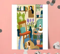 Quest'opera d'arte cattura uno spazio interno sereno con una sedia a dondolo, un cane che dorme e varie piante. Una tazza di tè e un libro su un tavolino arricchiscono il rifugio accogliente e tranquillo.