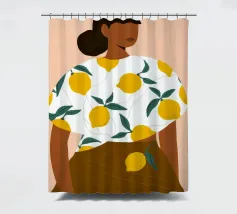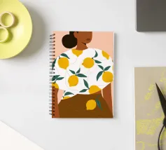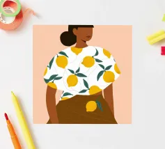 Una persona con i capelli scuri legati in uno chignon tiene in mano un bouquet di fiori di campo, vestita con le morbide tonalità della terra. Lo sfondo è costituito da delicati motivi geometrici, che rafforzano l'atmosfera pacifica.