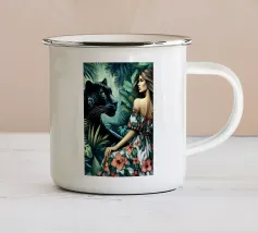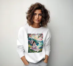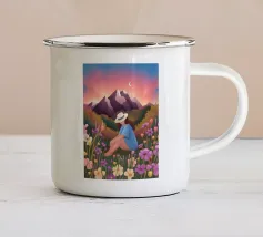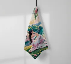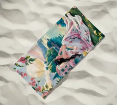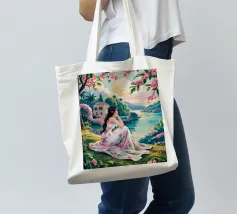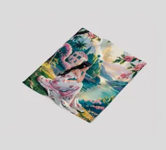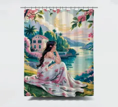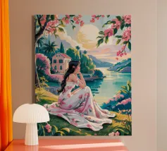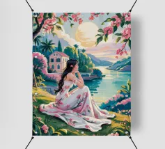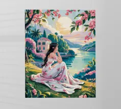 Una donna con un abito fluente siede sulla riva di un fiume, circondata da fiori rosa e da un'imponente vegetazione. Le acque serene esaltano l'atmosfera di pace.