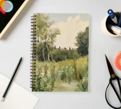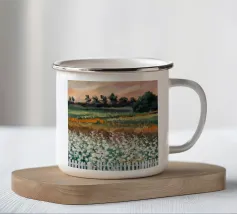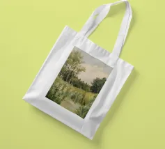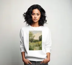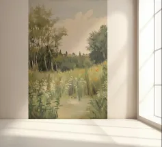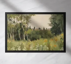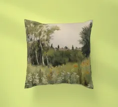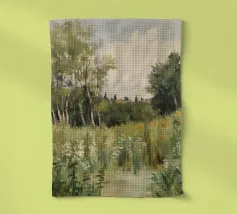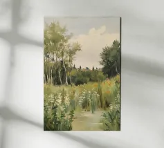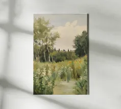 Paesaggio sereno con un piccolo stagno circondato da una vegetazione lussureggiante e fiori selvatici, con un folto gruppo di alberi e un lontano skyline del villaggio sotto un cielo parzialmente nuvoloso.