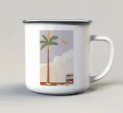 Illustrazione stilizzata e d'atmosfera di un tram che passa accanto a una palma solitaria in un cielo crepuscolare con una luna crescente. La scena ha un'atmosfera fresca, retrò e leggermente malinconica.