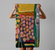 Sezioni di motivi e colori diversi, rossi, gialli, blu, bianchi e grigi, formano una composizione simile a una trapunta, creando un campo astratto tattile e visivamente diverso.