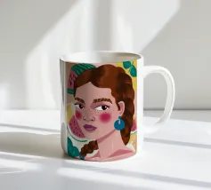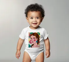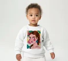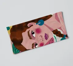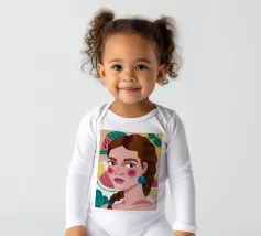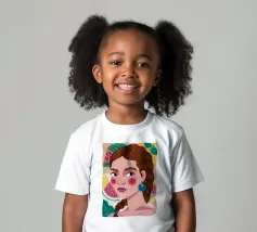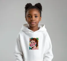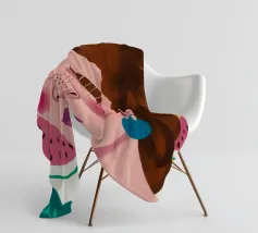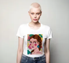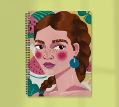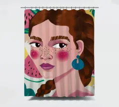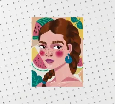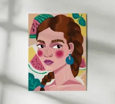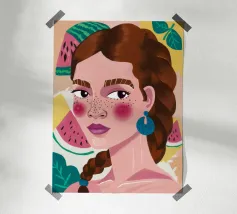 Questa opera d'arte mostra una figura con capelli intrecciati, adornata con fette di anguria. Lo sfondo è pieno di elementi di frutta colorati, che creano un'atmosfera fruttuosa e vibrante.