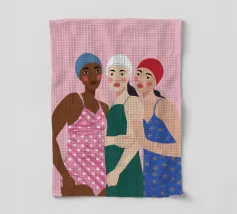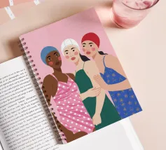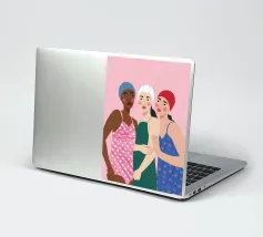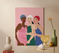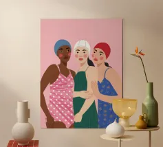 Un'illustrazione di tre donne diverse, vestite in modo elegante e unite in un abbraccio solidale. L'immagine è una bella e potente celebrazione dell'amicizia, dell'unità e della solidarietà femminile.
