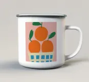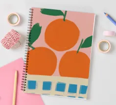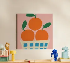 Tre arance perfette riposano in una semplice ciotola a fantasia su uno sfondo rosa tenue, creando una natura morta calma, equilibrata ed esteticamente piacevole con un tocco moderno.