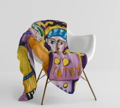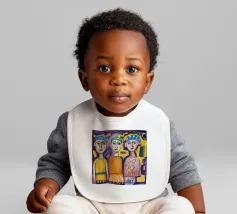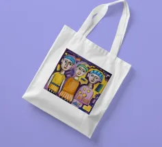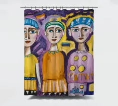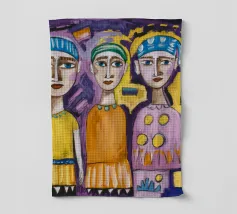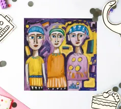 Il dipinto raffigura tre figure affiancate che indossano abiti e cappelli colorati. Lo sfondo è un mix di giallo e viola, con forme e motivi astratti.