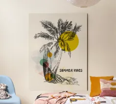 Catturate lo spirito dell'estate senza fine con questa illustrazione disegnata a mano di una palma e di una tavola da surf, accentuata da forme geometriche audaci e colorate in giallo, rosso, verde e blu. Combinando le vibrazioni rilassate della spiaggia con un tocco artistico moderno, questo schizzo minimalista porta l'energia della cultura del surf e della fuga tropicale in qualsiasi spazio. Perfetto per i surfisti, per l'arredamento della casa al mare o per gli amanti dell'arte estiva in stile retrò.