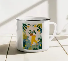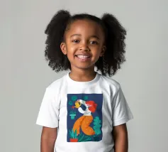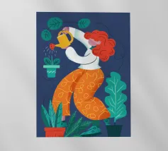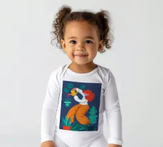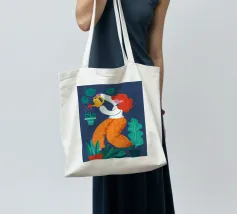 Una vivace e moderna natura morta con un tucano stilizzato, un vaso di fiori e una brocca blu. La composizione è una celebrazione audace, colorata ed eclettica della bellezza tropicale e della forma artistica.