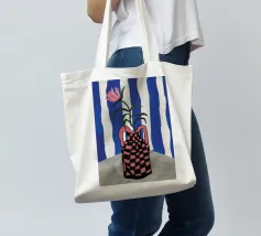 Un'audace natura morta presenta tulipani rosa in un vaso a scacchi bianchi e neri, su uno sfondo drammatico a strisce verticali bianche e blu scuro.