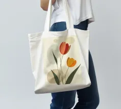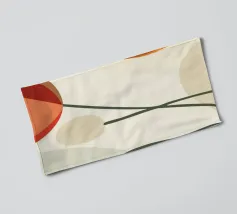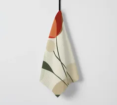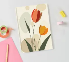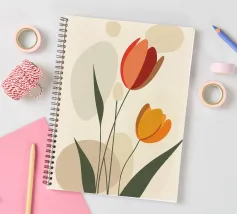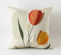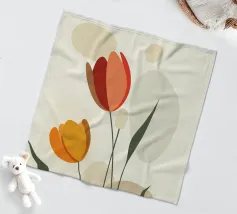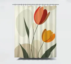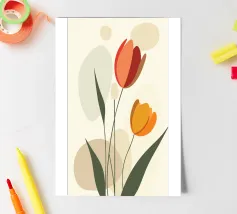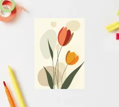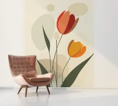 Questa grafica minimalista mostra due tulipani stilizzati nelle calde tonalità dell'arancio, del rosso e del giallo. Le forme sono chiare e moderne, completate da elementi di sfondo organici e colorati in beige e grigio. Le foglie e gli steli dei tulipani sono di colore verde scuro e formano un bel contrasto con i fiori. La composizione trasmette un'estetica calma e senza tempo ed è ideale come decorazione murale dal sapore naturale.